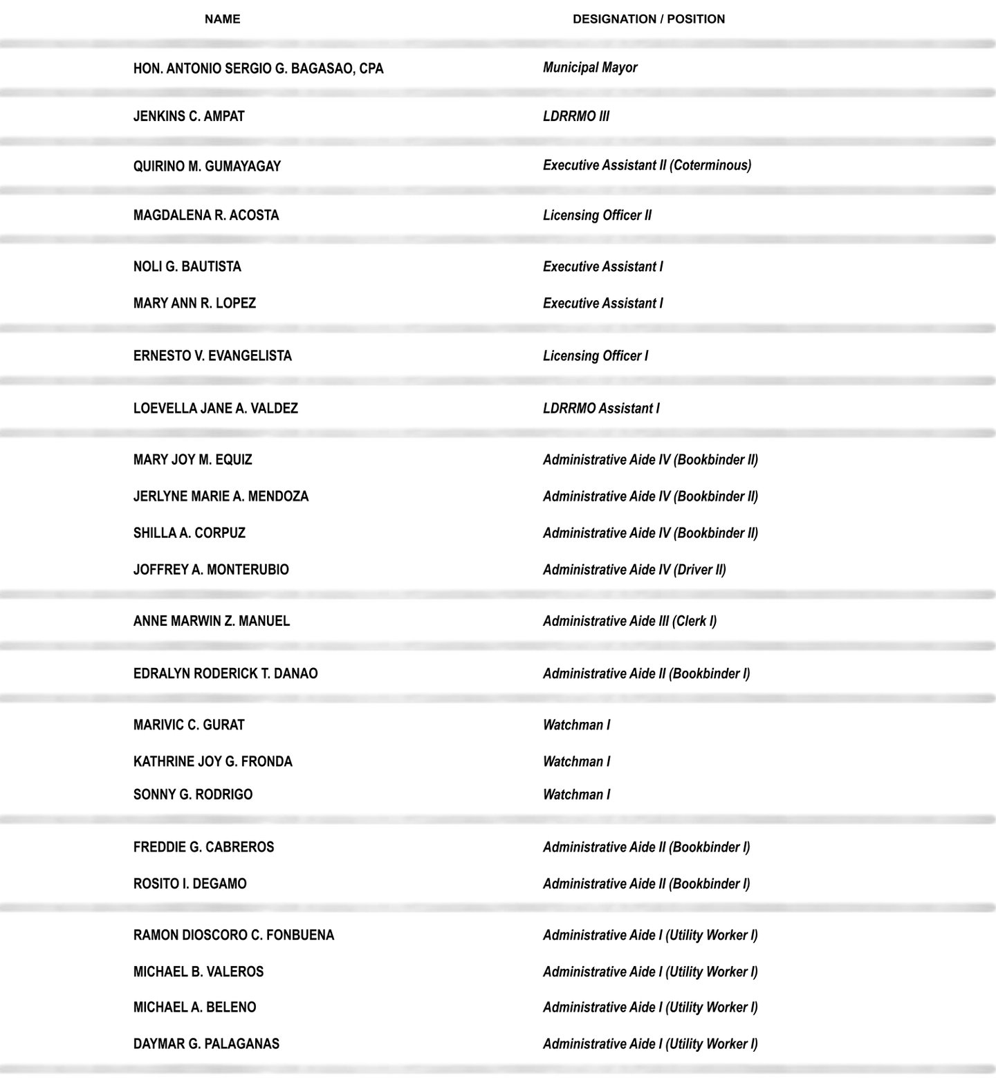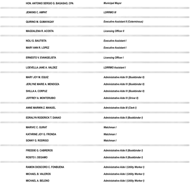 "We, the Municipal Officials and Employees of the Municipality of Bayombong, commit to extend quality delivery of the above cited services to the people of Bayombong. Equipped with the values of discipline, courtesy, honesty with the most desired proficiency and team work we pledge to perform with excellence"